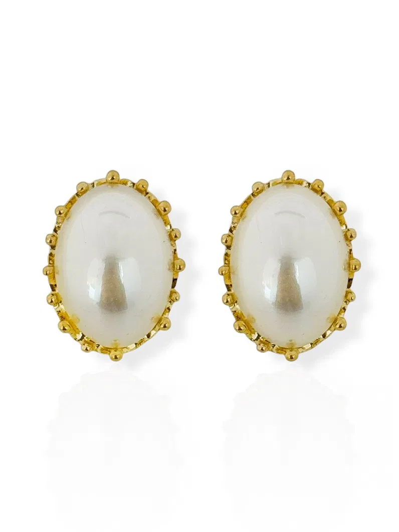 Brinco Pérola Oval Borda de Coroa- Folhado a Ouro 18K